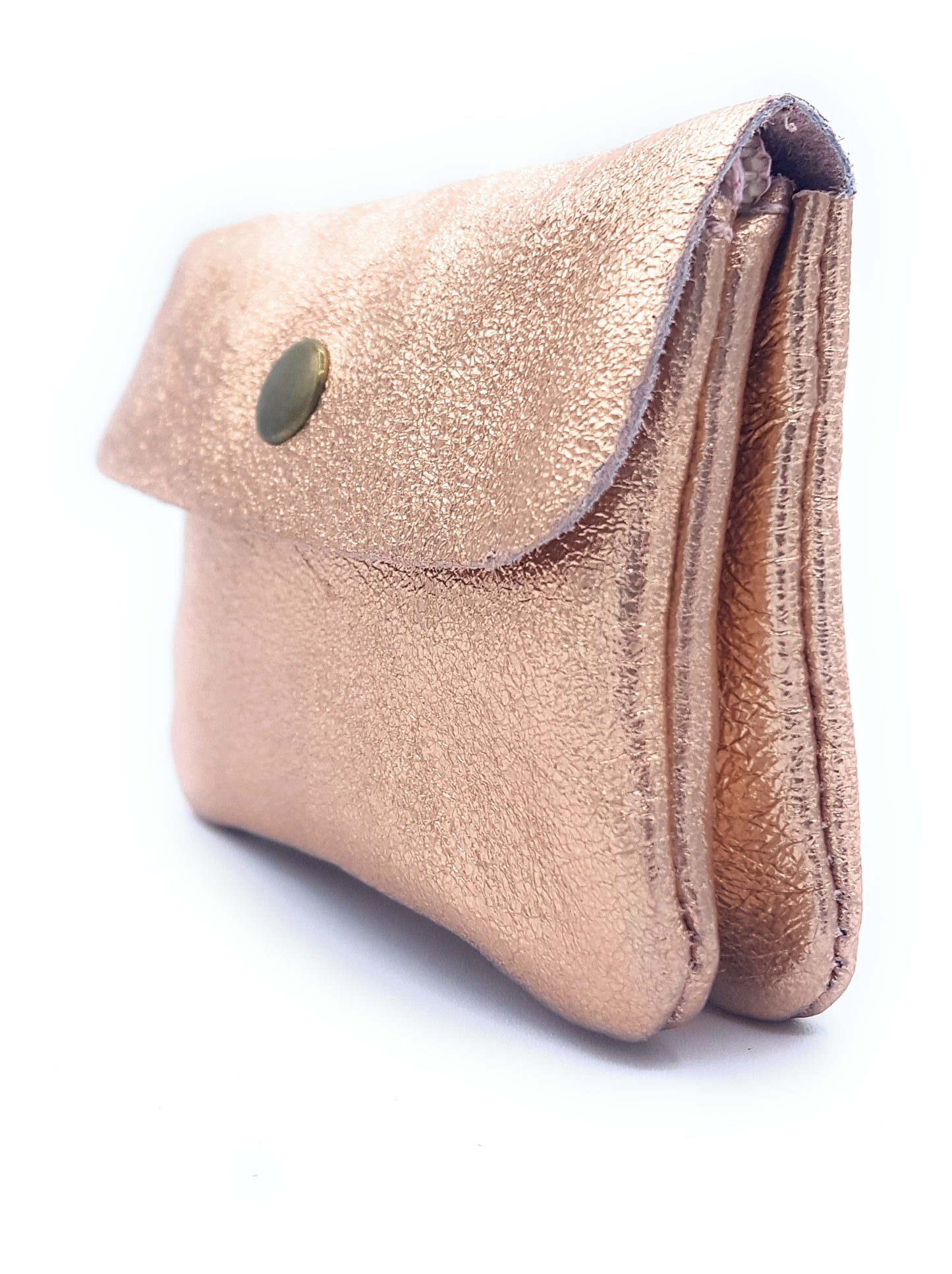 This Aponi wallet/card holder in iridescent (metallic) leather is the trendy "MUST" to have with you. It has 2 compartments to store cards and money, including 1 that closes with a zipper. The wallet closes with a snap flap.