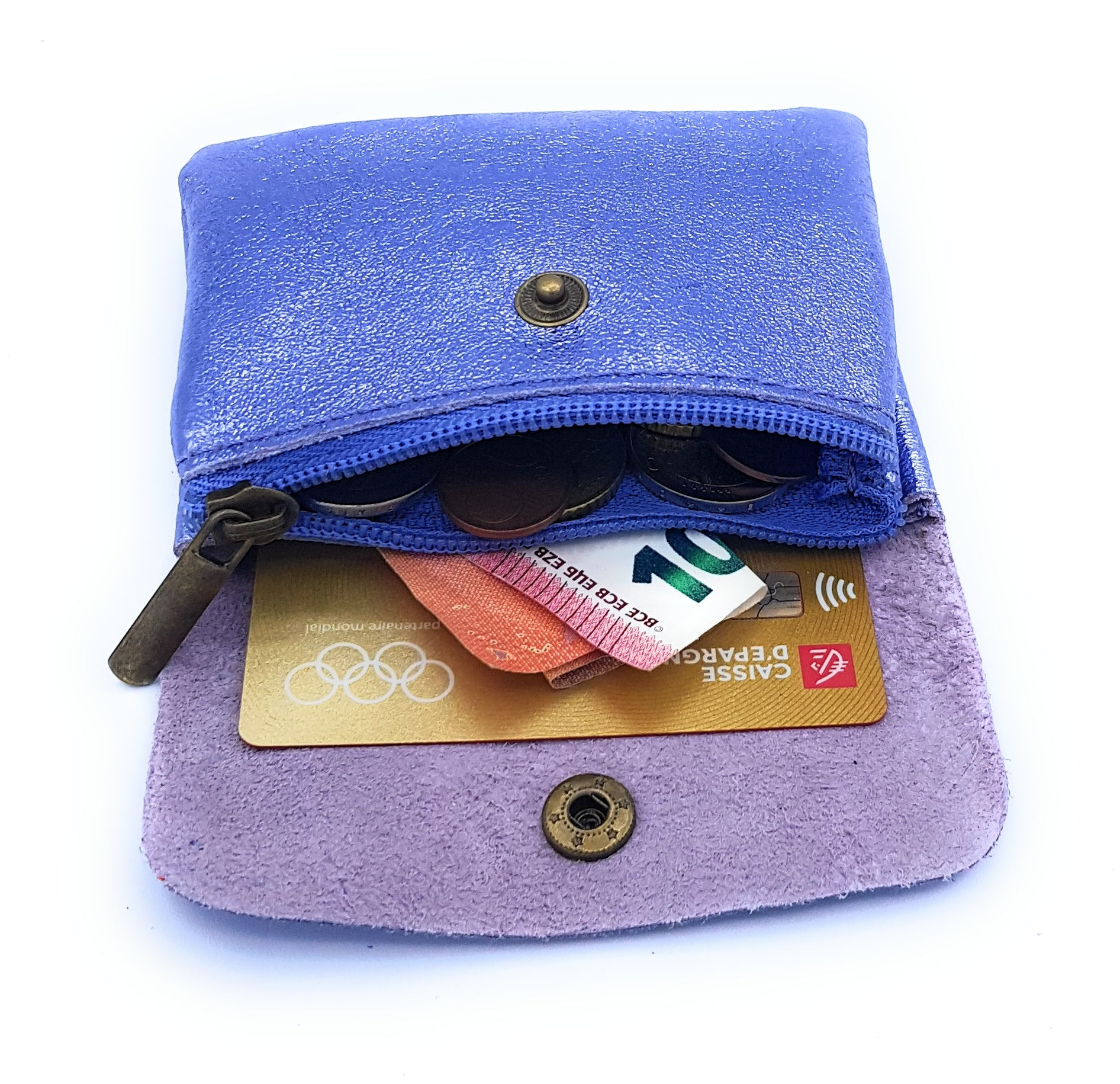 This Aponi wallet/card holder in iridescent (metallic) leather is the trendy "MUST" to have with you. It has 2 compartments to store cards and money, including 1 that closes with a zipper. The wallet closes with a snap flap.